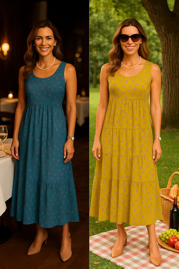 Avec sa coupe longue, sans manches et sa jupe fluide, elle se prête aussi bien aux looks quotidiens qu’aux occasions plus élégantes.