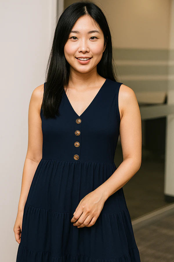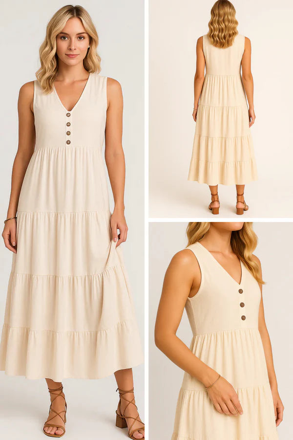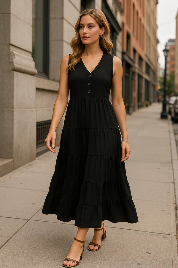 Sa coupe longue sans manches, ornée de trois volants, offre une allure fluide et raffinée.